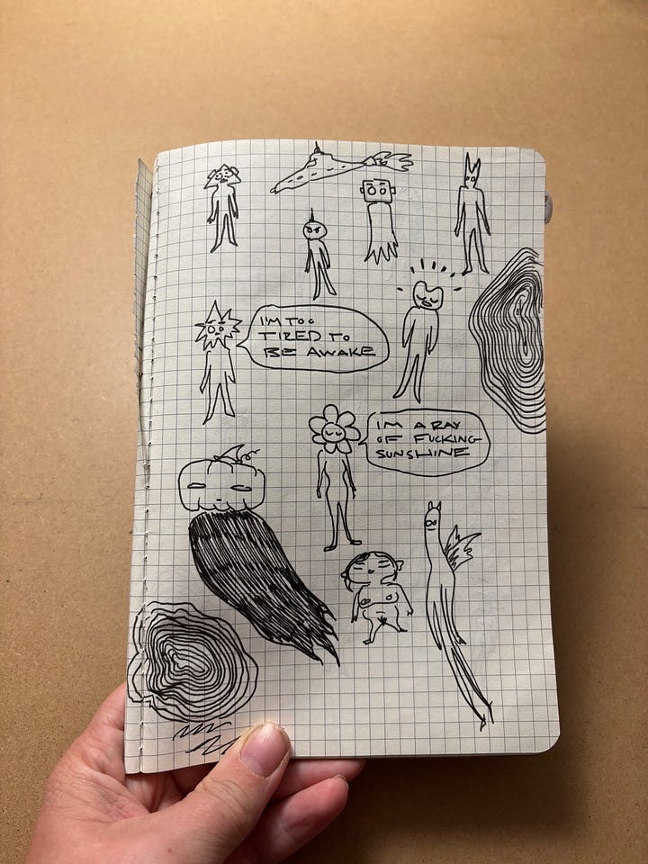 In this spirit, I try to have a daily(ish) freeform doodle session. It’s good to think of it as doodling because it’s not as serious as drawing. Personally, it helps me to keep these in a “messy art journal”. It’s a notebook full of lists, little poems, ideas and doodles. A bunch of stuff is scratched out and not drawn for people to see. The notebooks I use are made up of cheap grid paper that I don’t feel bad messing up. I use a black pen so I’m not tempted to erase.