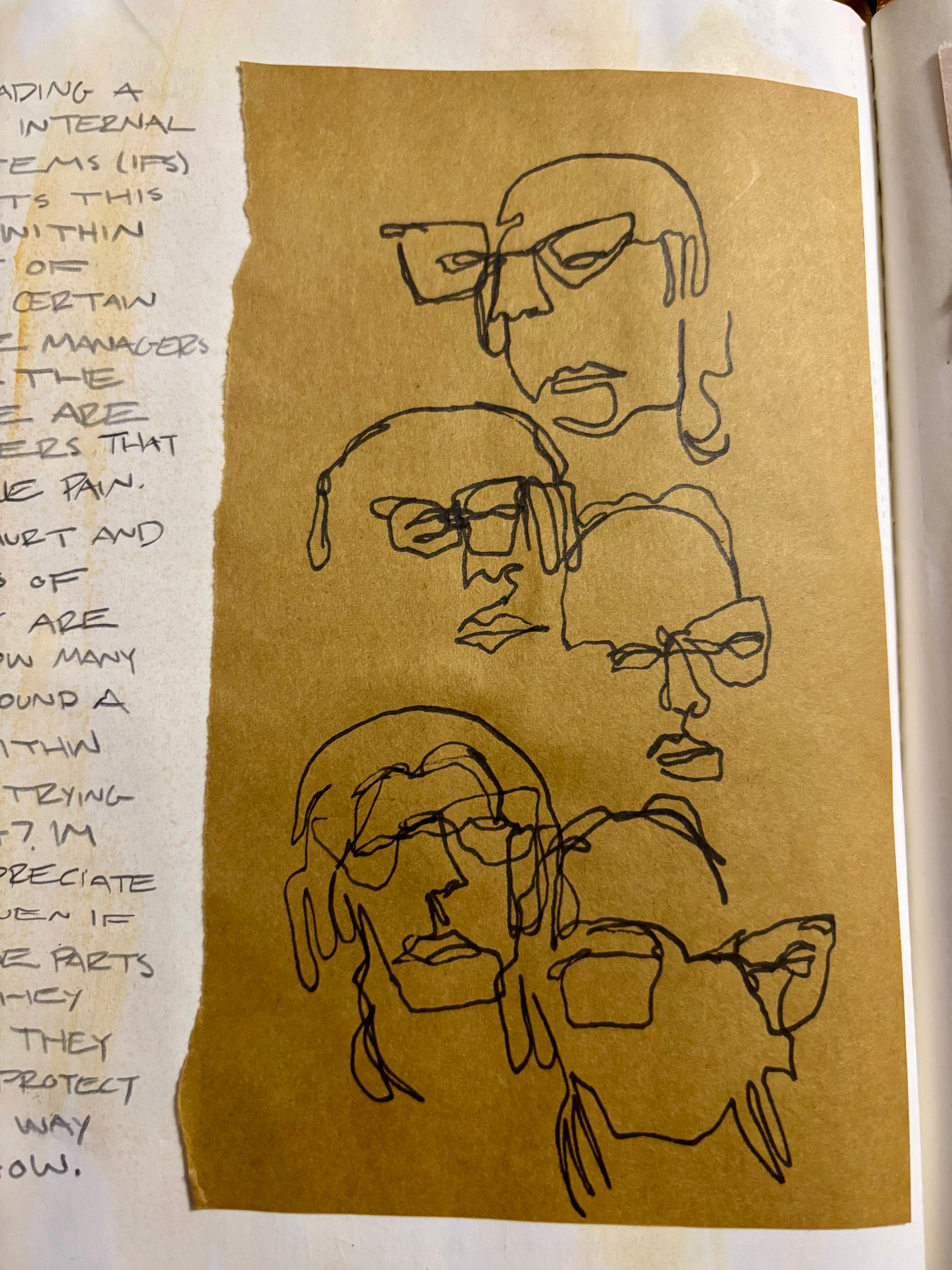 Blind contour drawings. This is where you draw an object or person from life without looking at the page or picking up the pen from the page. It’s easier if you pretend you are touching the shape of the object which the tip of the pen. Personally, I like to get a mirror out to make self portraits. But you can draw your hand, your drink, the object that is closest to you.